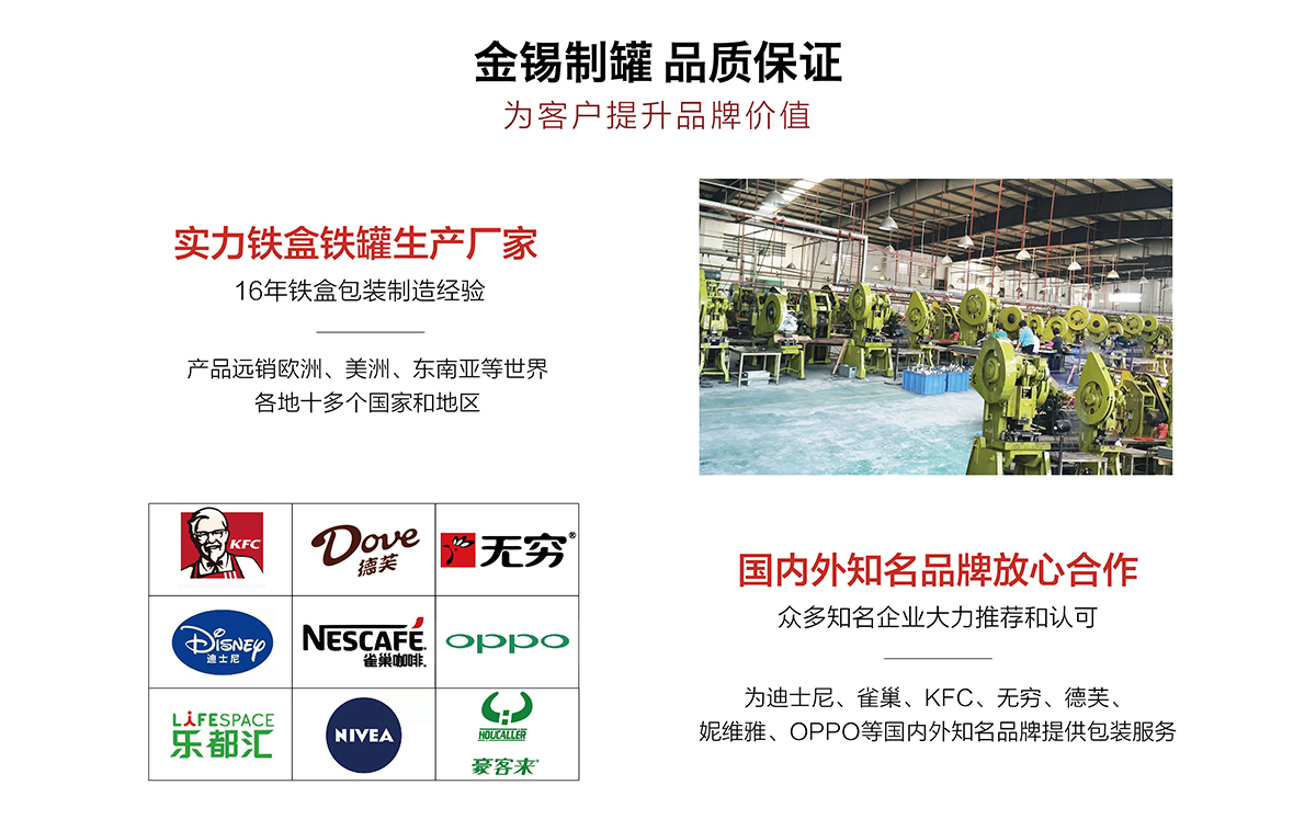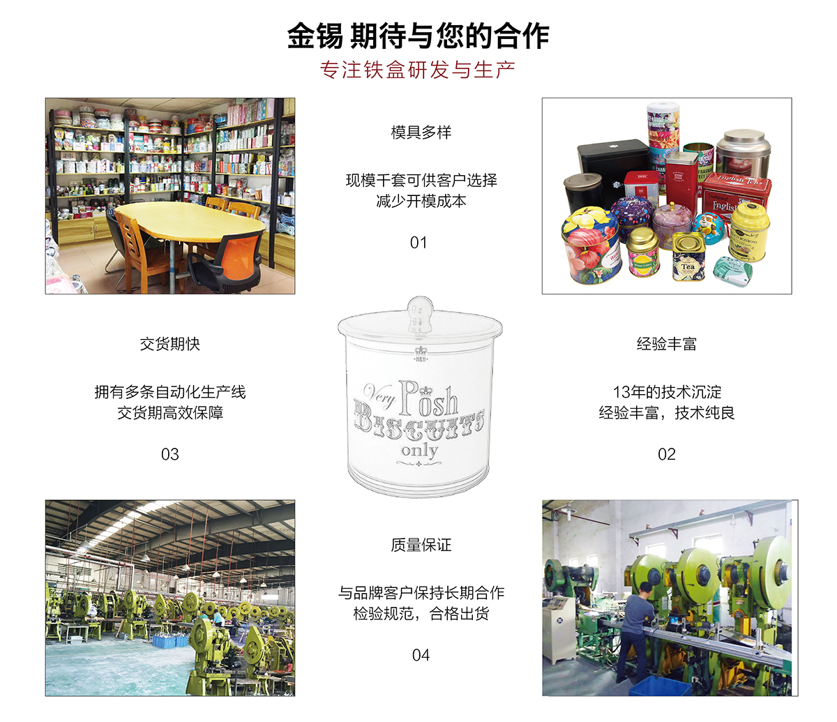 廣州市金錫五金制品有限公司成立于2016年,是已有13年生產(chǎn)經(jīng)驗的實力廠家。我廠是專業(yè)定制優(yōu)良馬口鐵盒、鐵罐、禮品盒、茶葉罐、月餅盒等金屬鐵盒包裝的制罐企業(yè),我們擁有超過6000平方米的標準現(xiàn)代化廠房及八條生產(chǎn)線。公司集產(chǎn)品研發(fā)、設計、生產(chǎn)、銷售于一體,技術(shù)優(yōu)良,實力雄厚。通過十多年的制罐經(jīng)驗,我們擁有專業(yè)的技術(shù)團隊,嚴格的作業(yè)流程、完整的品質(zhì)保障體系、完善的銷售以及售后服務系統(tǒng)。